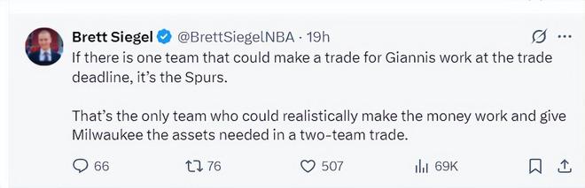 根据美记Brett Siegel说法,如果本赛季有球队可以负担扬尼斯的交易资产,那么就是马刺队,马刺是唯一可以满足雄鹿所需要求的球队。(因为此前雷霆记者已经明确表态,虽然手握多个首轮签但对扬尼斯毫无兴趣)