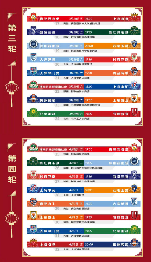 2025赛季中超赛程:2月22日开幕 首场蓉城vs三镇 次轮京沪大战