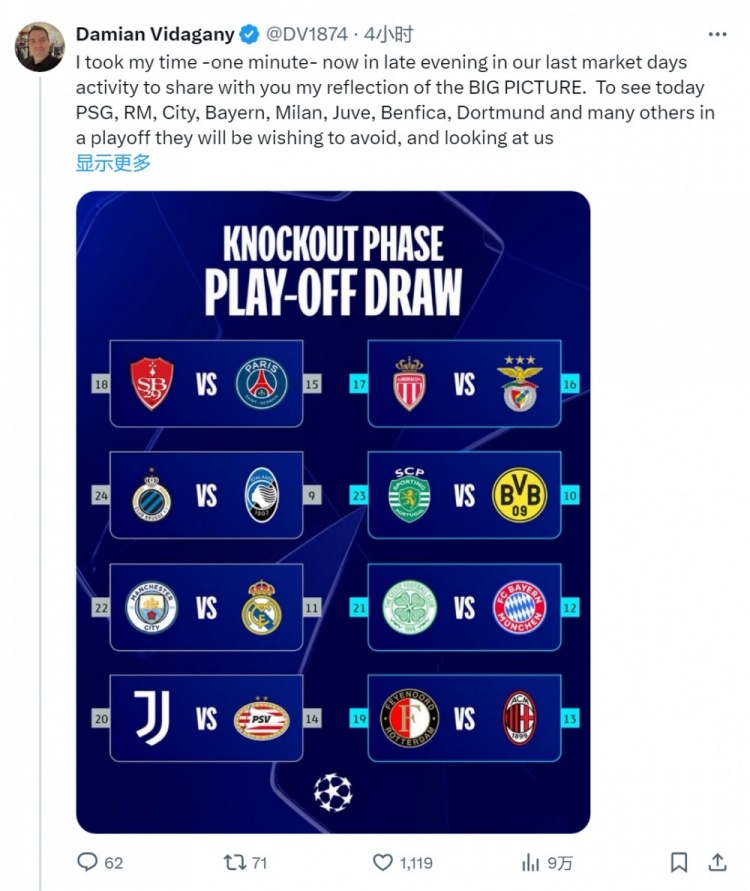 维达加尼晒出欧冠附加赛的对阵表,并写道:“在冬窗尾声阶段的晚上,我花一分钟的时间与大家分享我对整体情况的看法。看到巴黎、皇马、曼城、拜仁、米兰、尤文、本菲卡、多特和许多其他球队都得参加原本想要避免的附加赛,而羞羞视频在线观看网站最终却取得了更好的成绩,这让我为埃梅里、球员、蒙奇、老板和所有幕后人员的辛勤工作感到骄傲。”
