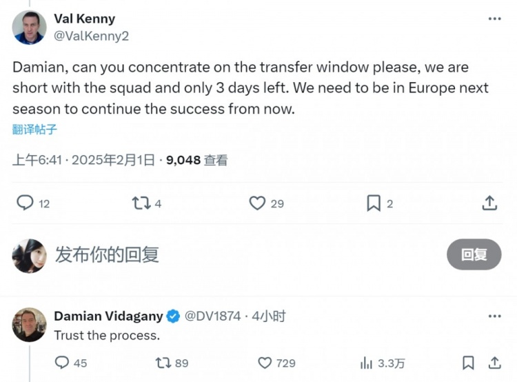 - 球迷社媒留言要求维拉总监引援,后者回复:相信过程