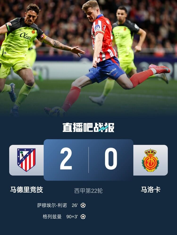 格列兹曼破门,马竞2-0战胜马洛卡。